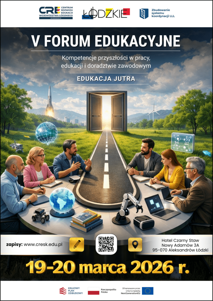 Centrum Rozwoju Edukacji Województwa Łódzkiego w Skierniewicach zaprasza nauczycieli, doradców zawodowych oraz wszystkie osoby zainteresowane tematem na bezpłatną konferencję V Forum Edukacyjne „Kompetencje przyszłości w pracy, edukacji i doradztwie zawodowym – edukacja jutra”. Konferencja odbędzie się w dniach 19–20 marca 2026 roku w Hotelu Czarny Staw (Nowy Adamów 3A, 95-070 Aleksandrów Łódzki). Uczestnikom zapewniamy bezpłatny nocleg i wyżywienie.
